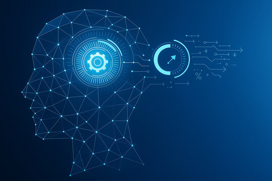 AI generated image of abstract human head made of glowing network lines with mechanical icons and digital data flow representing artificial intelligence and information processing