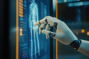 A robotic hand interacts with a digital display showing a 3D human anatomy model  Detailed graphical data and anatomical structures are visible on the screen