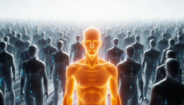 Vibrant glowing human figure stands out from a digital crowd, symbolizing individuality and technological advancement.
