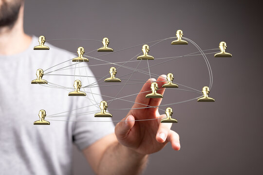 Abstract image representing communication teamwork and technology with interconnected people icons and hand.