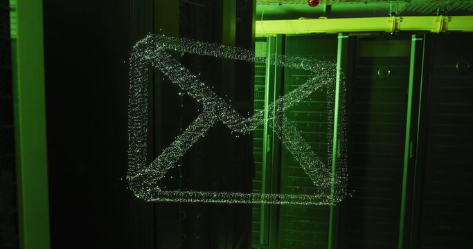 Digital icons and data processing illuminated in a modern server room at sunset, digital icons and data processing over computer servers