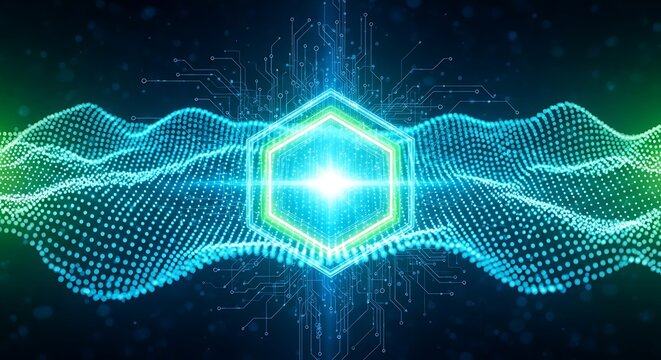 Futuristic Digital Hexagon Core Emitting Light Surrounded by Abstract Data Waves