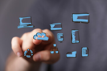 Cloud technology and data storage concept with businessman using laptop and smartphone, digital cloud computing icons representing networking, online service, internet connection,