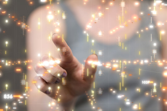 A man is pointing at a green screen with a lot of numbers and dots. Concept of technology and complexity, as the man's finger is hovering over the screen