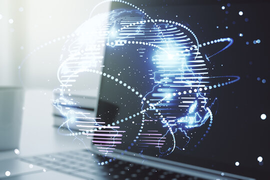 Double exposure of abstract digital world map with connections on computer background, big data and blockchain concept