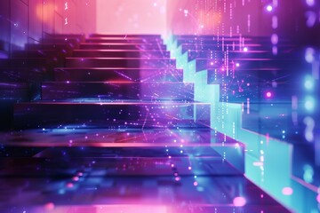 A vibrant stairway glows with colorful lights and digital motifs, creating a futuristic atmosphere that suggests movement and progress in an urban space.