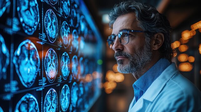 A middle-aged European doctor studies brain imaging on a digital screen. He appears thoughtful, reflecting on patient information.