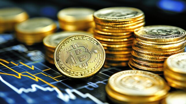 Stacks of shimmering gold coins rise alongside an upward-directed graph against a clean white backdrop, symbolizing financial growth and success
