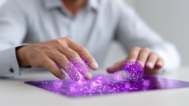 Person Interacting with Digital Hologram of Purple Particles in a Bright Office Environment, Showcasing Modern Technology and Innovation Concepts
