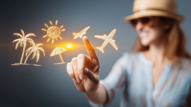A traveler interacts with a glowing summer travel interface, featuring minimalist icons  clean, modern, and vacation-ready.