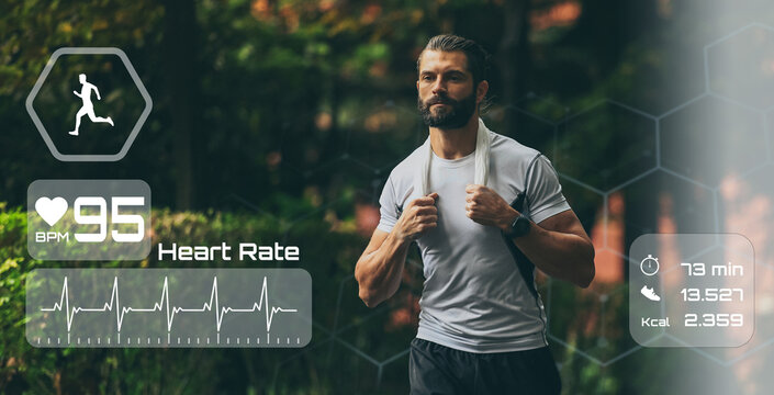 Man running in the park. Runner check heartbeat, steps and distance. Technology, health concept.
