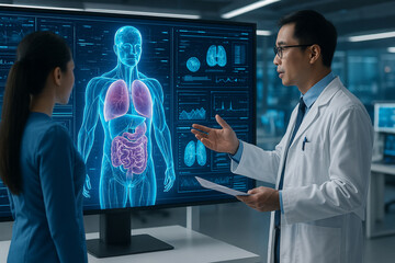 AI generated futuristic scene showing doctors analyzing human body with glowing holographic organs and health data interface in modern research laboratory