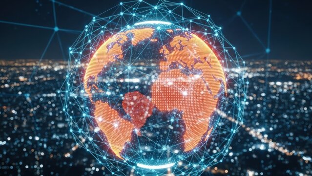 This image features a futuristic representation of earth combined with data charts over a keyboard, symbolizing advancements in technology and global business analytics. Xenic