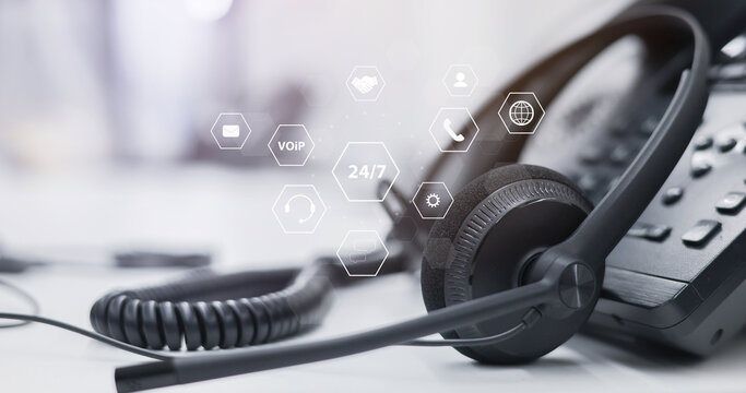 close up telephone voip machine with virtual icon of service provider of communication technology  in the office desk  operation station room for business and contact us concept