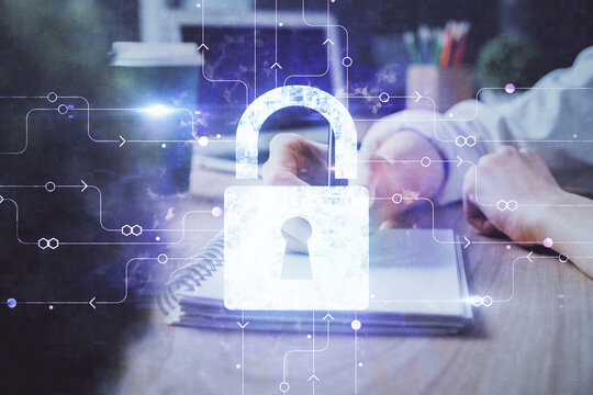 Double exposure of woman's hands writing with lock icon. Concept of security and protection of data