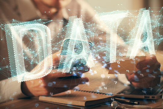 Double exposure of data theme drawing and mobile phone background. Concept of innovation