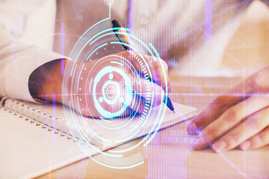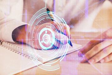 Multi exposure of woman's writing hand on background with data technology hologram. Concept of innovation.