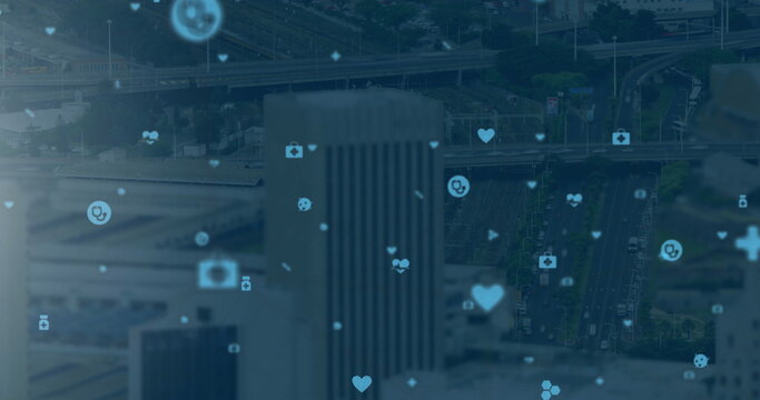 Artificial intelligence digital interface with futuristic icons over cityscape at night symbolizing neural networks and machine learning technology.