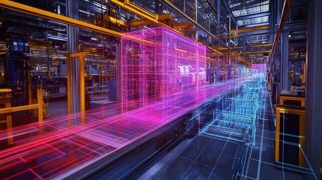 Modern warehouse with digital data overlay