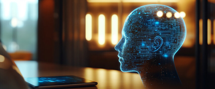Digital head profile, circuit lines, glowing blue, modern technology concept, AI, artificial intelligence, future, innovation, digital, technology background,  tablet device