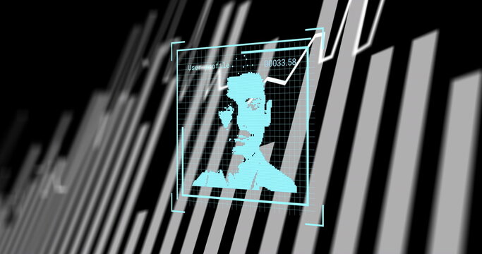 Cyan pixelated face mesh scanning within holographic frame, with grid overlay and graph display