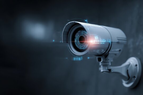 Biometric security and innovation technology concept with CCTV camera on dark wall and digital screen with radar information and fingerprint