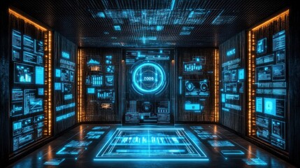 A computer room with many monitors and a large screen. The monitors are all lit up and show various data and information. The room has a futuristic and high-tech vibe, with the screens