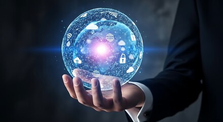 Businessman holding a glowing blue sphere with cloud and security icons inside his hand
