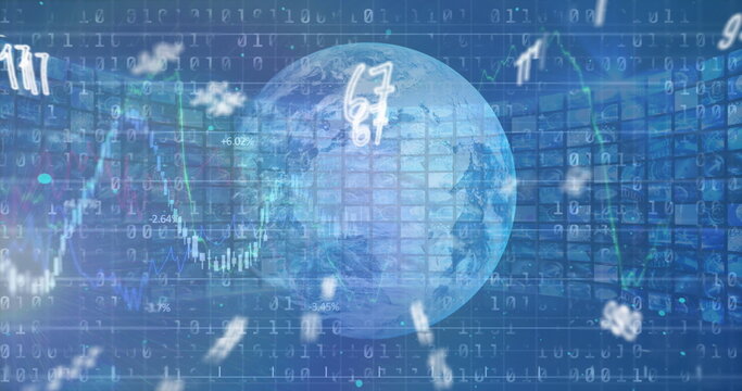 Image of financial data processing and numbers changing over globe