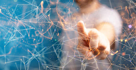 A hand points upwards, touching a glowing, digital number one formed from interconnected light lines against a cloudy sky.