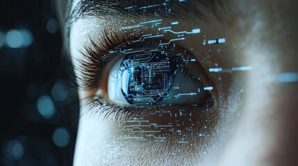 Close-up of a human eye, with digital circuitry overlays on the iris and around the eye