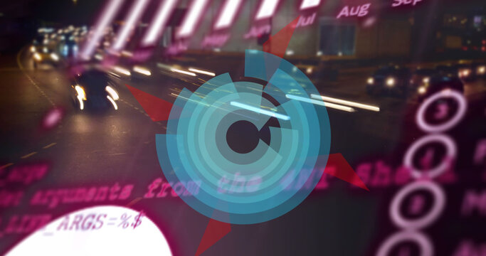 Image of network of icons over scopes scanning and data processing on screens