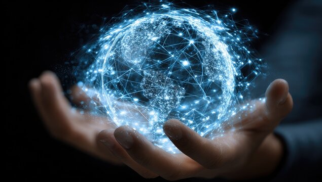 A hand holds a glowing, network-connected globe
