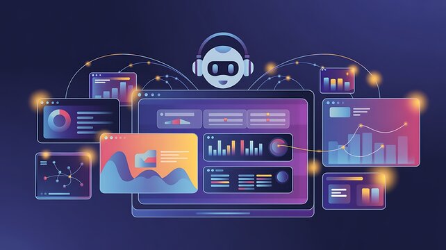 Digital screens present a futuristic interface with various graphs, charts, and information, visualizing complex data and technology concepts for business intelligence and communication