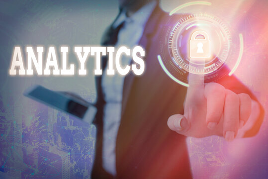 Text sign showing Analytics. Business photo showcasing method of logical analysis of income, profits, losses, etc. Graphics padlock for web data information security application system