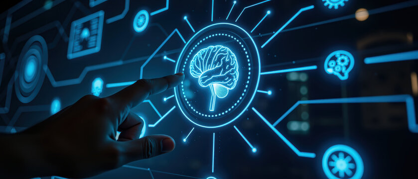 Digital brain interface technology, futuristic design, glowing circuits, human interaction, innovation, artificial intelligence
