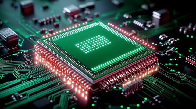 High-Tech Microchip on Circuit Board with Glowing LED Lights
