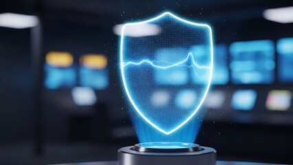 Futuristic Neon Shield Hologram Displaying Security Data.
