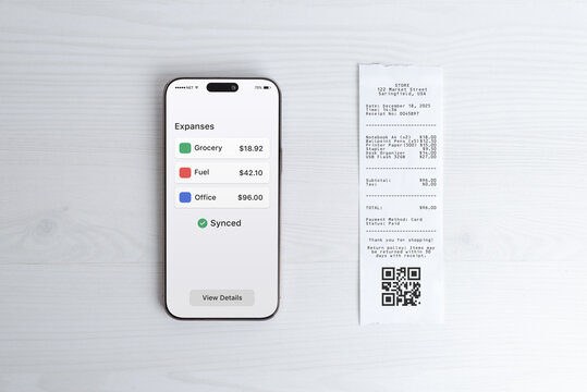 Smartphone displaying expense overview dashboard next to paper receipt, modern bookkeeping and finance app concept for business reporting, analytics, and digital expense tracking