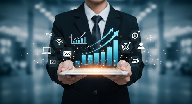 Businessman presents a digital interface showing growth charts and communication icons, visualizing business strategy and technological advancement.