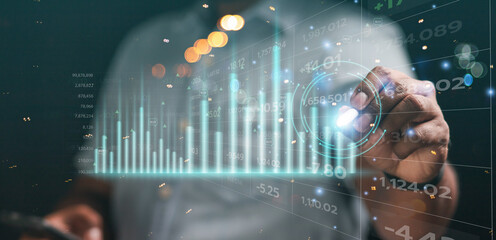 Hand pointing at digital screen displaying 2025 date with colorful financial data for data analysis, forecasting trends, and stock market predictions in technology.