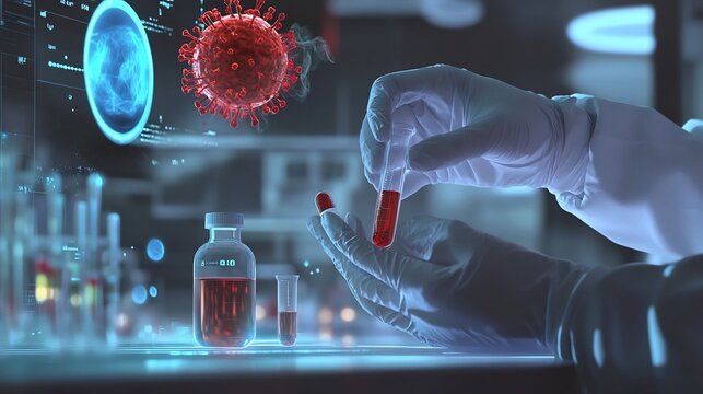 Scientist holds vials with glowing data interface. Futuristic lab research shows genome sequencing analysis. Red viruses float around tiny samples for medical discovery.