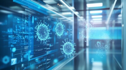 A scientific environment showcases intricate virus structures displayed on transparent screens, with vibrant digital interfaces illuminating the laboratory