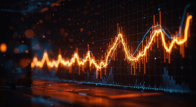 Vibrant glowing orange financial market trend line chart displaying volatile upward movement against a dark background