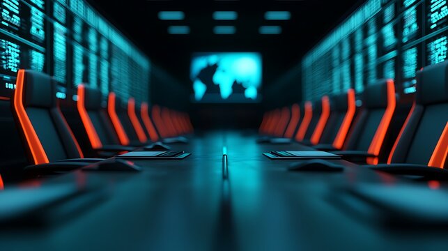 Futuristic control room featuring multiple high-tech digital screens displaying complex data and analytics under low ambient lighting for advanced monitoring and analysis