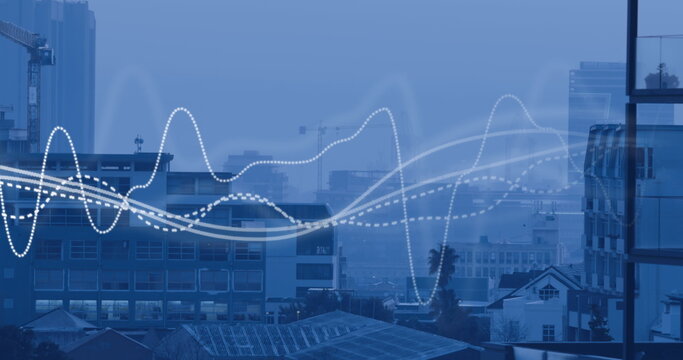 Abstract digital interface over urban scene depicting data connectivity