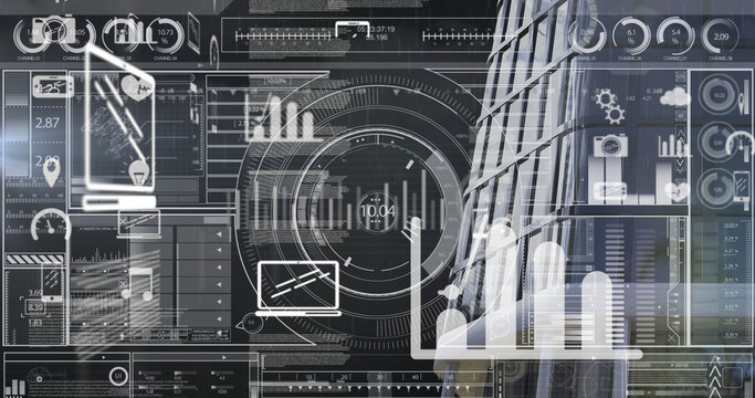 Image of financial data processing over building