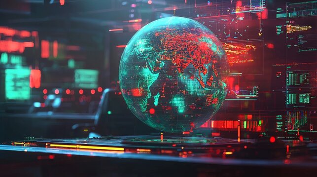 Futuristic Digital Globe with Holographic Data Screens Cyberpunk Technology Aesthetic