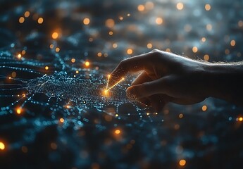 Hand Interacting With Glowing Network Data Visualization
