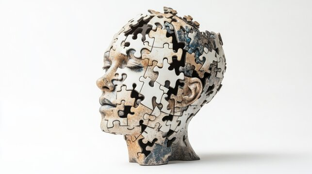 A 3D puzzle of a human head with missing pieces, highlighting mental health challenges on white